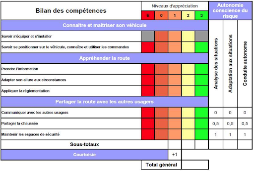 5 grands domaines de compétences seront évalués : connaître et maîtriser son véhicule, appréhender la route, partager la route avec les autres usagers, la courtoisie, l’autonomie et la conscience du risque.